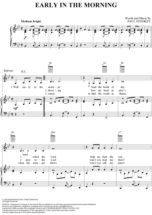 Digital Sheet Music for Early in the Morning by Noel Paul Stookey, Peter, Paul and Mary scored for Piano/Vocal/Chords; id:259140