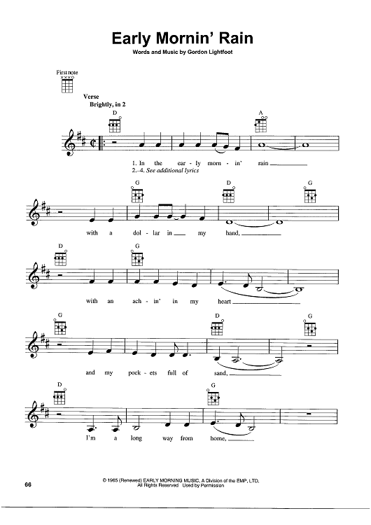 Digital Sheet Music for Early Mornin' Rain by Gordon Lightfoot scored for Ukulele/Vocal; id:449020