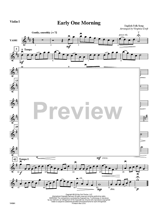 Digital Sheet Music for Early One Morning - Violin 1 by English Folk Song, Virginia Croft scored for Orchestra; id:411065