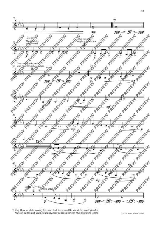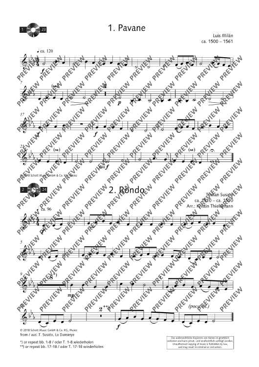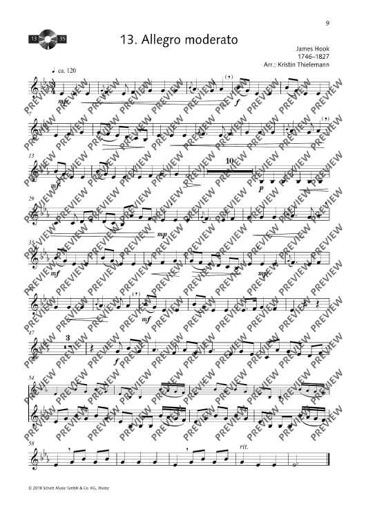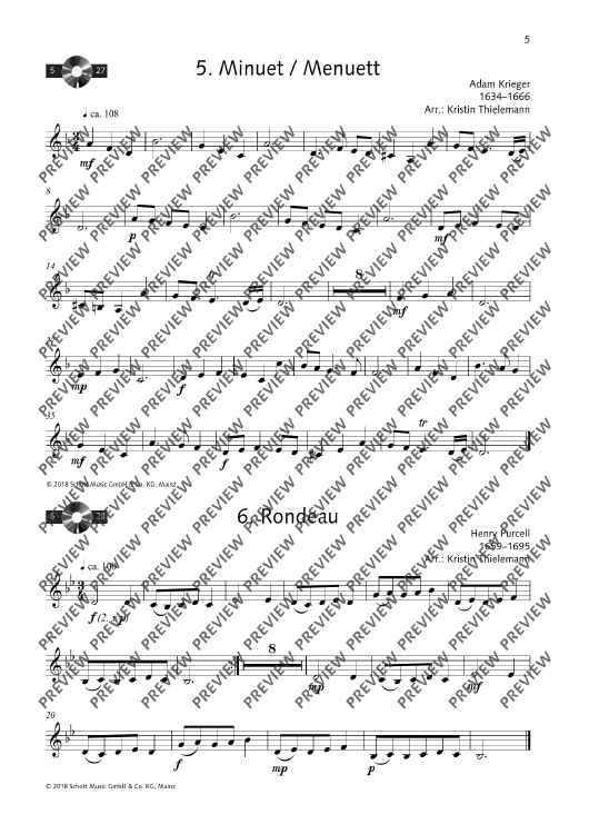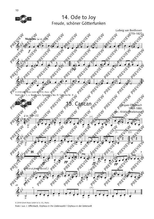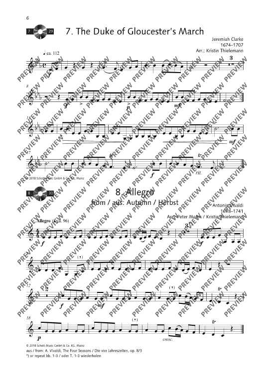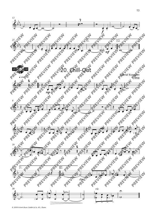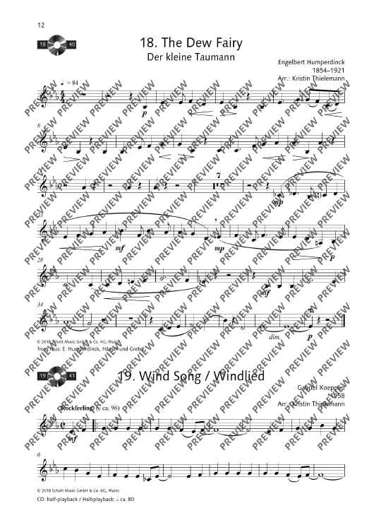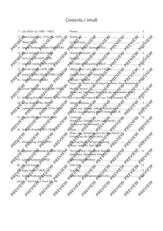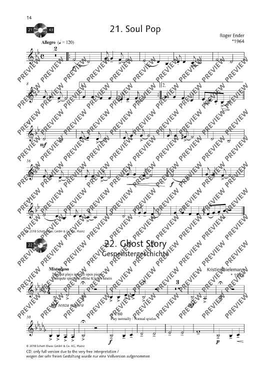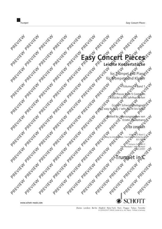 Einzelstimme für Trompete in C zum Download, ergänzend zum Heft Easy Concert Pieces, Band 1 (ED 22555) Die Reihe Easy Concert Pieces enthält leichte bis mittelschwere Werke für Trompete mit Klavierbegleitung. Nach Schwierigkeitsgrad in drei Bänden geordnet finden sich für allle Epochen repräsentative Stücke, die sich für Vorspiele, Wettbewerbe oder Prüfungen eignen. Zudem dienen die Easy Concert Pieces als motivierende Ergänzung im Trompetenunterricht. Band 1 (ED 22555) – Schwierigkeitsgrad: sehr leicht bis leicht – enthält Stücke bis zum notierten c‘‘, in einigen wenigen Stücken kommt das d‘‘ als kurzer Spitzenton vor. Einfache und eingängige Rhythmen, gut ausführbare Tonverbindungen und Artikulationen, die bereits nach kurzer Zeit leicht beherrscht werden, machen diesen Band zu einem idealen Heft für Einsteiger. Band 2 (ED 22556) – Schwierigkeitsgrad: leicht bis mittel – beinhaltet Werke bis maximal zum notierten f‘‘. Neben dem erweiterten Rhythmusspektrum und leicht erhöhten Anforderungen in Phrasierung und Artikulation eignen sich diese Werke, um musikalisch differenzierter zu arbeiten. Band 3 (ED 22557) – Schwierigkeitsgrad: mittel – wendet sich an Spielerinnen und Spieler mit gut ausgebildetem Ansatz, die den Tonraum bis zum notierten g‘‘ beherrschen, wobei dieser Ton nur als kurzer Spitzenton vorkommt. Flexibilität in Artikulation und Legatospiel sowie eine gut ausgebildete dynamische Bandbreite werden für die im Vergleich zu den vorherigen Bänden längeren Stücke vorausgesetzt.