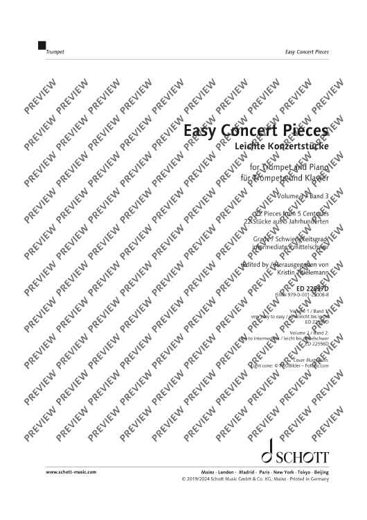 The Easy Concert Pieces series presents easy to intermediate pieces for trumpet with piano accompaniment. Pieces typical of their era and suitable for auditions, public performance, competitions or examinations are ordered according to level of difficulty in three volumes. These Easy Concert Pieces also provide appealing additional material for use in trumpet lessons. In addition to the enclosed part for trumpet in Bb, a part for trumpet in C (Schott ED 22557-1) is available for download at www.schott-music.com. Volume 1 (ED 22555) contains very easy to easy pieces with a range up to written c”, with d” appearing as a short top note in just a few pieces. Simple and memorable rhythms, readily playable note sequences and patterns of articulation that can be mastered quickly and easily make this book ideal for beginners. Volume 2 (ED 22556) contains easy to intermediate pieces with a range no higher than f”. Besides extending rhythmic scope and requiring a little more in terms of phrasing and articulation, these pieces will encourage further exploration of musical contrasts. Volume 3 (ED 22557) is of medium difficulty and intended for players with a well-developed embouchure who can play notes up to written g”, though this note only appears as a short top note. Flexible articulation and legato playing with a well-developed dynamic range are required for pieces that are longer than those in the preceding volumes.