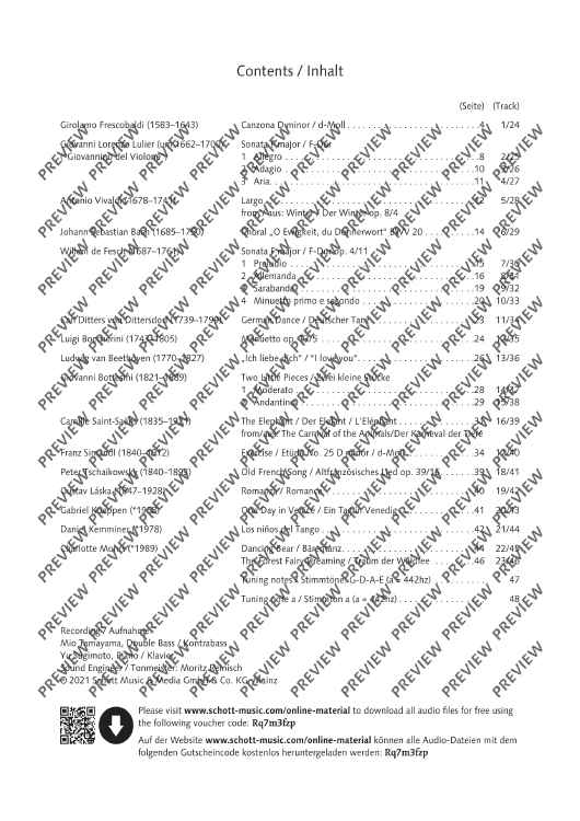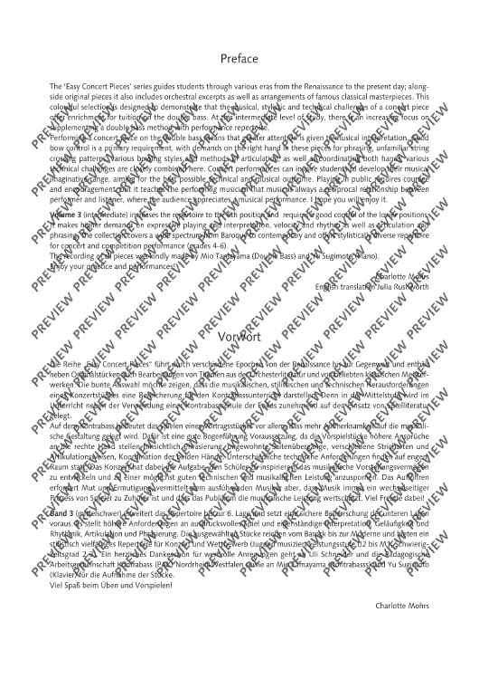 The “Easy Concert Pieces” series offers a wide spectrum of pieces from the Renaissance, Baroque, Classical, Romantic and Modern eras. The repertoire enriches the daily exercises and double bass tutor and is suited for all kinds of auditions. It contains original works for double bass solo as well as orchestral excerpts and arrangements of famous classical masterpieces. Volume 1 (easy) contains pieces in half and first position, with easy rhythms and melodies. It includes easy strokes and articulations such as portato, staccato and legato. Some pieces contain easy Flageolets. This volume offers a broad selection of classical masterpieces in easy arrangements.Volume 2 (easy to intermediate) contains pieces up to the 3rd position. As some new double bass tutors have a different approach in introducing position changes, volume 2 offers several pieces which reach the 2nd position, some pieces using only 1st and 3rd positions and some more difficult pieces which encompass all positions from half to third position. This volume consists of more original works.Volume 3 (intermediate) increases the repertoire up to the 6th position and requires a good control of the lower positions. It makes higher demands on expressive playing and interpretation, velocity and rhythm, as well as bowing techniques with articulation and phrasing.