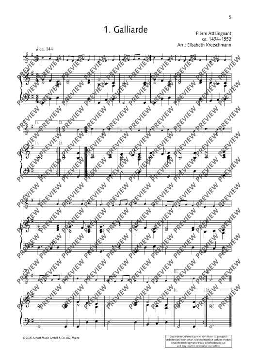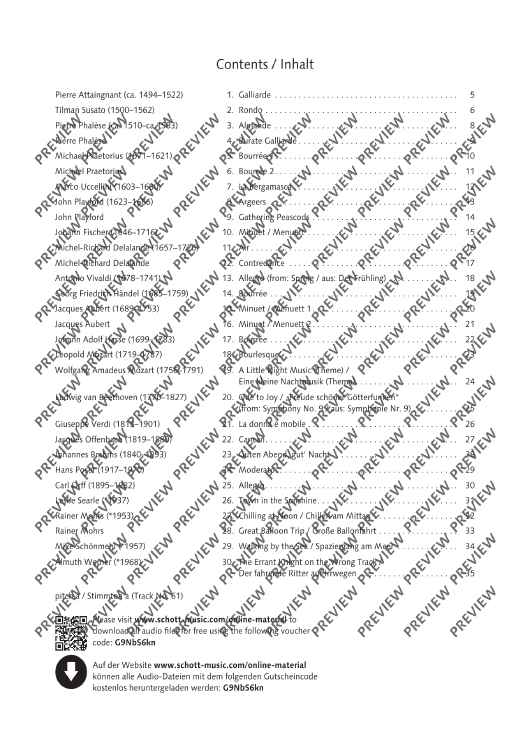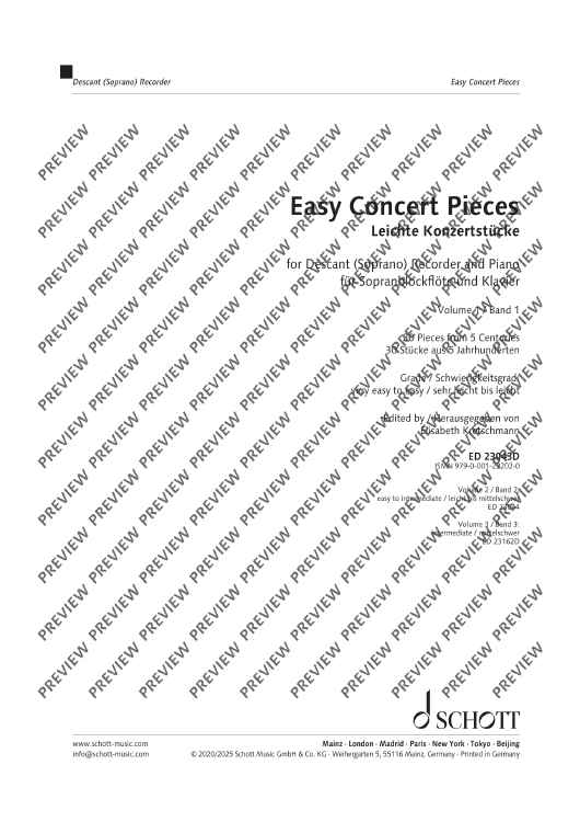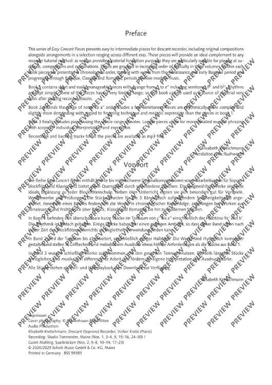 The Easy Concert Pieces series has the right pieces ready for the first concerts. Easy to intermediate original compositions and arrangements for descant recorder and piano provide a cross section of the different epochs, from the Renaissance to the modern era. All pieces as full versions and as piano accompaniment for playing along are available for download. Vol. 1 contains short, easy-to-grasp pieces ranging from c' to e'' including the semitones f sharp' and b flat'. The rhythm is simple. Some pieces have only a small ambitus so that this volume can be used as accompanying booklet after even a short period of recorder lessons.