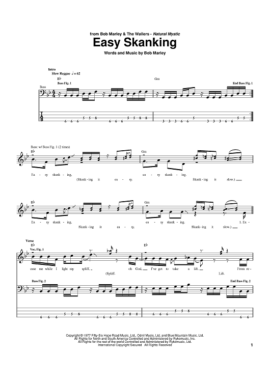 Digital Sheet Music for Easy Skanking by Bob Marley scored for Bass Tab; id:371296