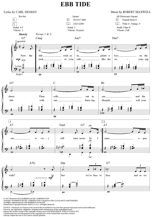 Digital Sheet Music for Ebb Tide by Robert Maxwell, Carl Sigman scored for Easy Organ/Vocal; id:251410