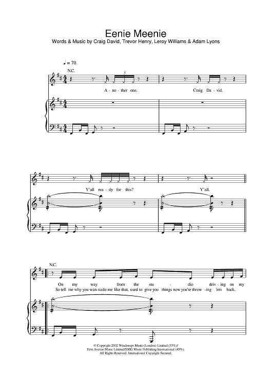 Digital Sheet Music for Eenie Meenie by Craig David, Trevor Henry, Leroy Williams, Adam Lyons scored for Piano/Vocal/Chords; id:377893