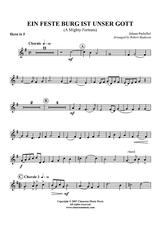 Digital Sheet Music for Ein feste Burg unser Gott - Horn in F by Johann Pachelbel, Robert Madeson scored for Brass Quintet; id:365577