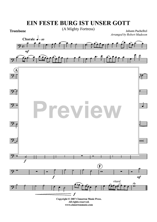 Digital Sheet Music for Ein feste Burg unser Gott - Trombone by Johann Pachelbel, Robert Madeson scored for Brass Quintet; id:365578
