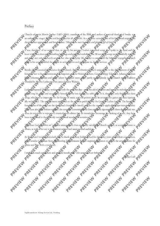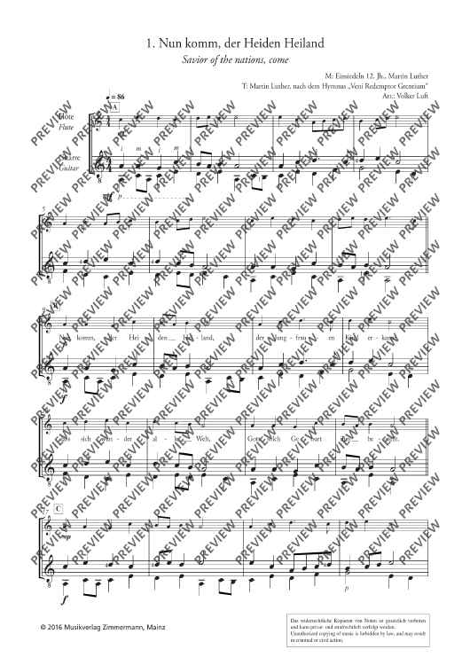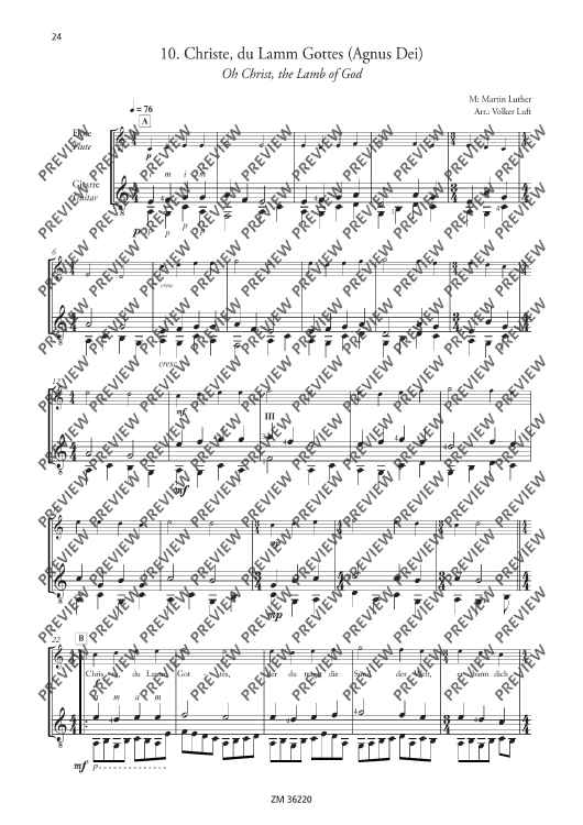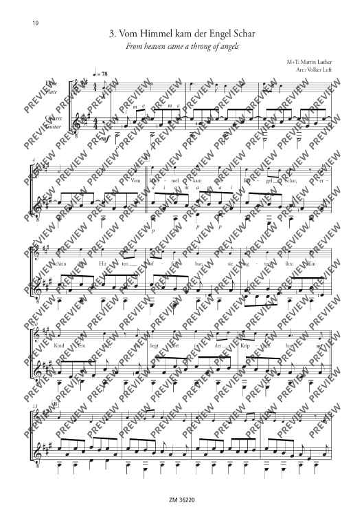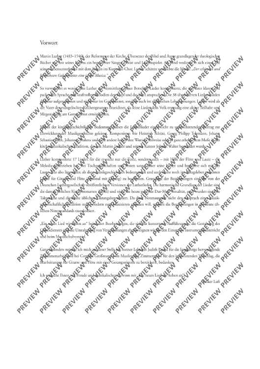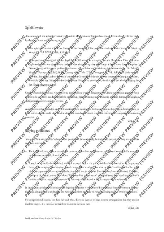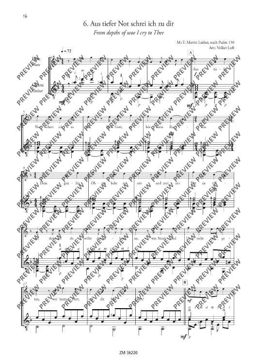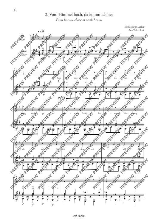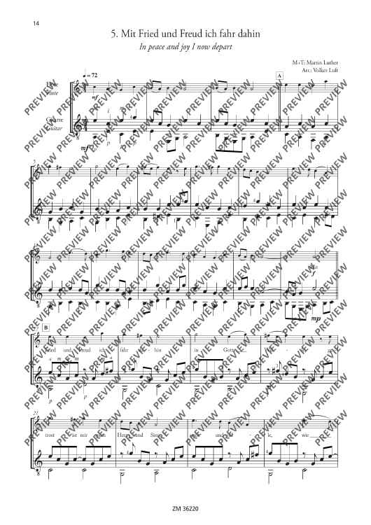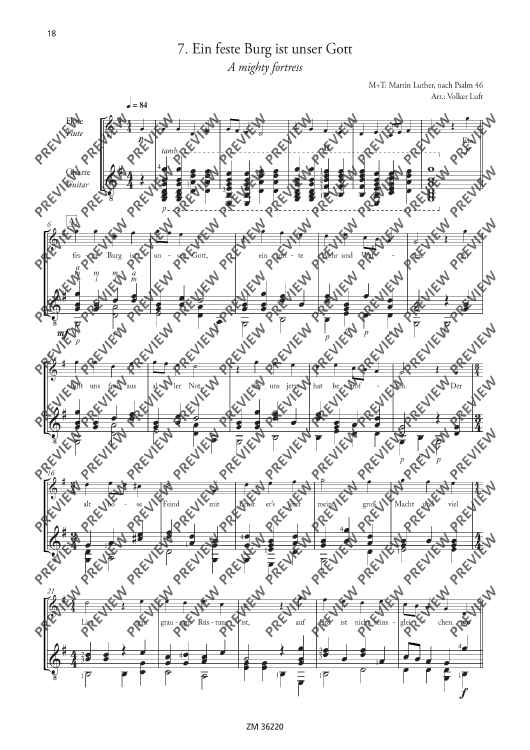 Church reformist Martin Luther was an enthusiastic flautist and lute player. He composed all his famous songs ("From heaven above", "A mighty fortress", etc…) with the aid of both instruments. It is, therefore, only fitting that these songs be arranged for flute and guitar (optionally with singing). The arrangements of "A new song we raise" are suitable for various situations: ensemble playing, concerts, church services, accompaniment to events, use in instrument tuition and music school auditions.
