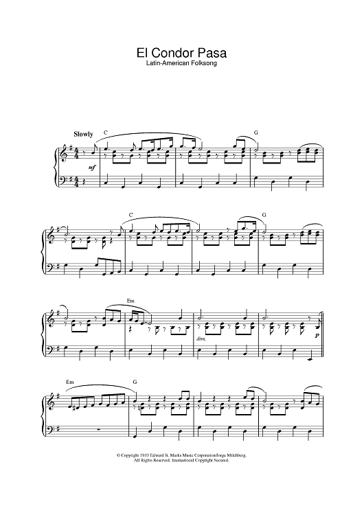 Digital Sheet Music for El Condor Pasa by scored for Piano; id:376876