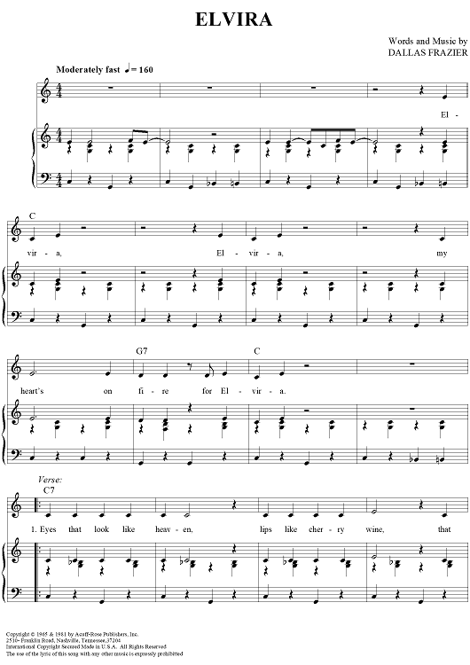 Digital Sheet Music for Elvira by Dallas Frazier, The Oak Ridge Boys scored for Piano/Vocal/Chords; id:360911