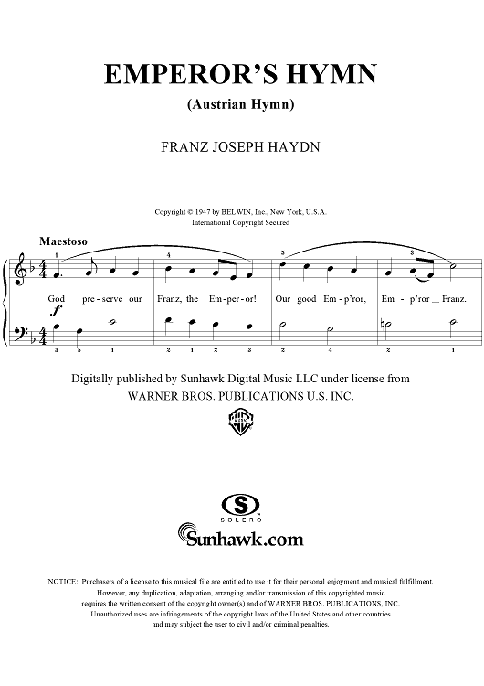 Digital Sheet Music for Emperor's Hymn (Austrian Hymn) by Franz Joseph Haydn, John W. Schaum scored for Easy Piano/Vocal; id:296207