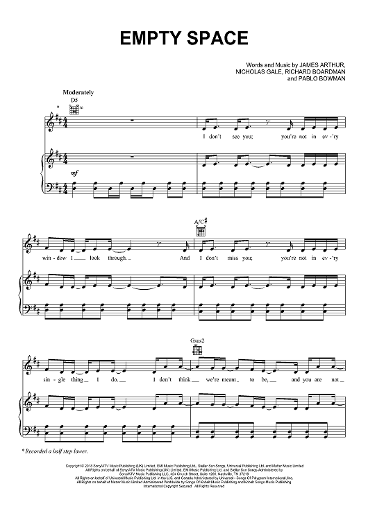 Digital Sheet Music for Empty Space by James Arthur, Richard Boardman, Nicholas Gale, Pablo Bowman scored for Piano/Vocal/Chords; id:466852