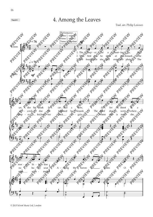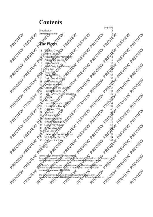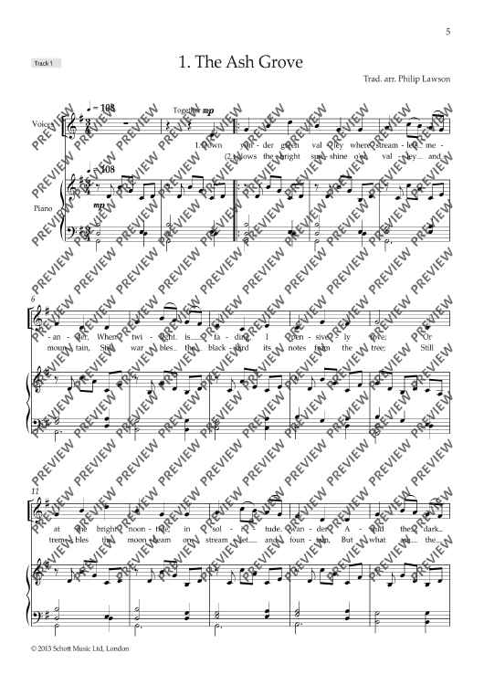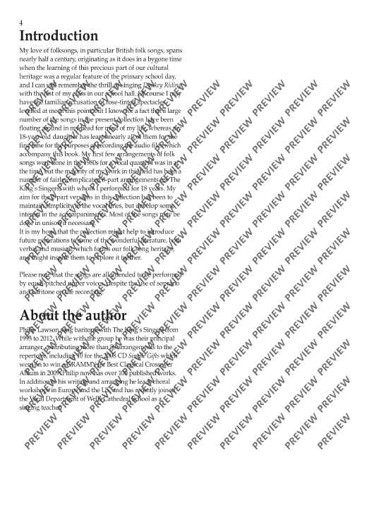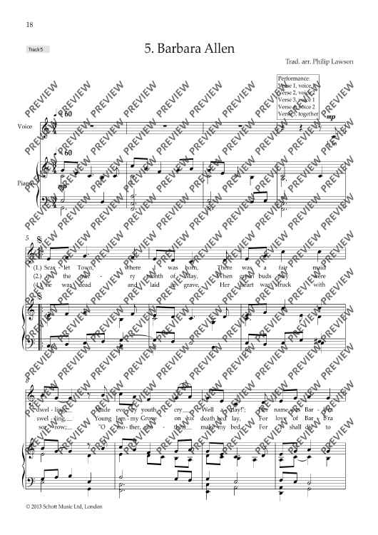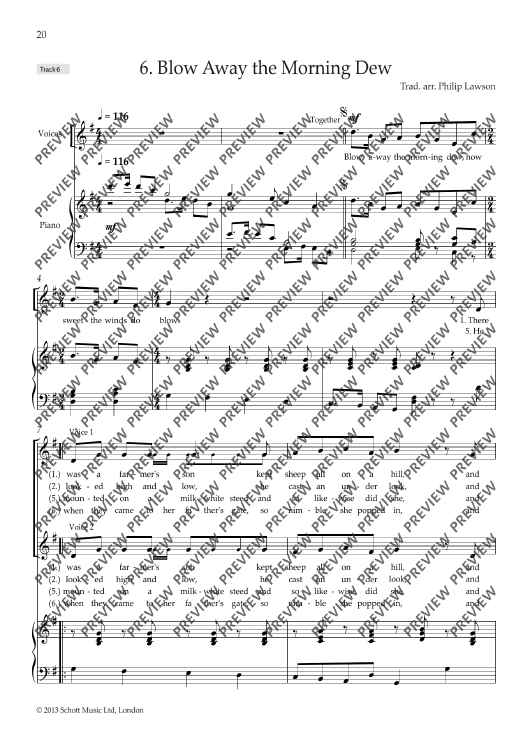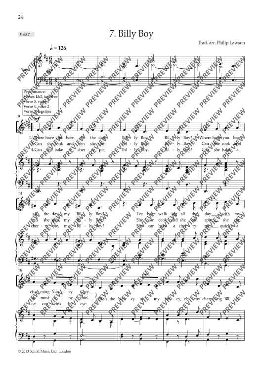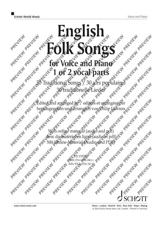 English Folk Songs is a collection of 30 arrangements for 1 or 2 voices and piano, of traditional tunes. Put together by the highly regarded singer and arranger Philip Lawson, the volume contains well known songs such as Ash Grove and Scarborough Fair, as well as many lesser known pieces. Audio recordings of all tunes performed by Philip and Sophie Lawson are available for free download. German and French translations of all texts are available as pdf downloads from the Schott Music website. Suitable for singers of grades 3-8.
