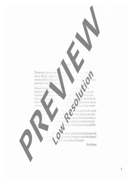 The best way to learn any instrument is to have lessons from a good, experienced teacher. Although, happily, the number of such teachers is constantly growing, the recorder is still frequently taught by enthusiastic but inexperienced teachers and many players start by teaching themselves. This series of books sets out to help learners of all ages in all three situations. Experienced teachers, who may choose to disregard much of the text as personal demonstration is always clearer than the written word, will find exercises and fine tunes a-plenty to support their own method at each stage. The less experienced willbenefit from many valuable teaching hints culled from long experience and may rely on the books to lead to a sound playing technique and a mastery of simple notation. Those learning by themseves - and I started in this way - are urged to work carefully and systematically through the books, taking plenty of time to assimilate each point before moving on. For them, without the personal model provided by a live teacher, it is vitally important to listen as often as possible to fine players, in person or on record, so that they have in their mind's ear a clear notion of the kind of sound they would like to produce. But however they start, I can only wish that all who use these books will derive as much pleasure and musical satisfaction and gain as many lasting and valued friendships as I have through this most subtle, delightful and sociable of instruments. (Brian Bonsor) “...this work is likely to become a standart work very quickly and is to be recommended to all schools where recorder studies are undertaken“ (Oliver James, Contact Magazine) These two tutors, with accompanying teacher's books, are for newcomers to the instrument who are beginning on the treble and so assume no previous knowledge either of the instrument or of musical notation.
