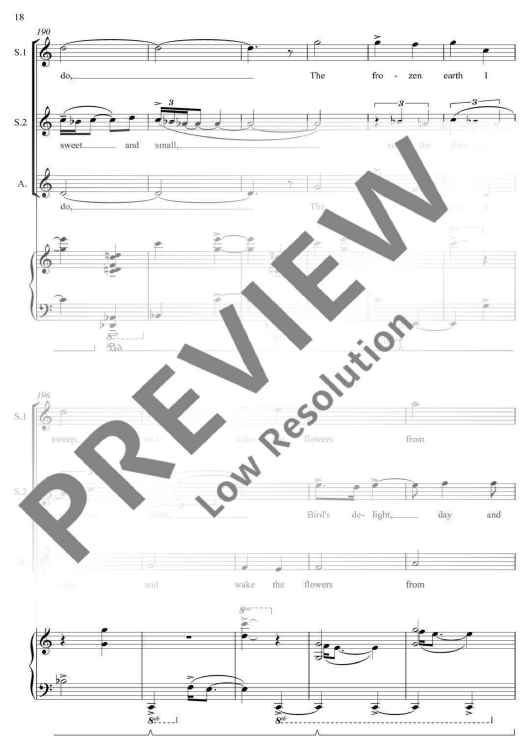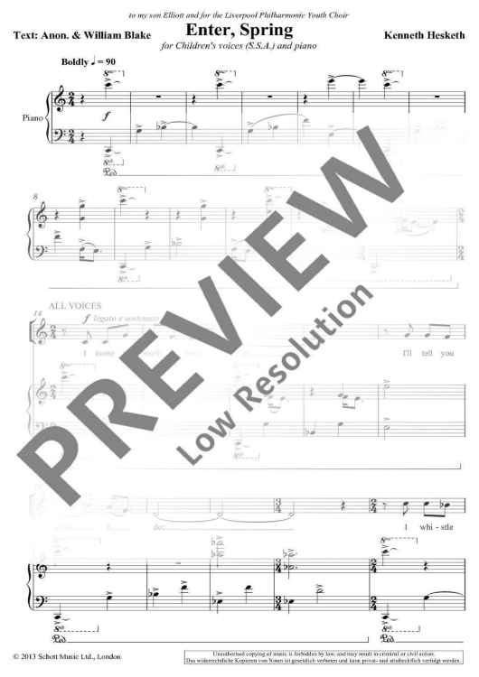 Hesketh’s work for 3-part children’s choir and piano sets two texts about the start of spring by William Blake and an anonymous source. Written for conductor Simon Emery and the Liverpool Philharmonic Youth Choir, Enter, Spring mixes contrapuntal and homophonic textures in the choir, supported by a lively accompaniment.