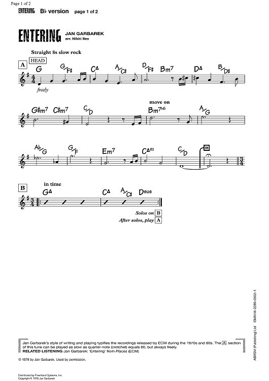 Digital Sheet Music for Entering by , Jan Garbarek, Nikki Iles scored for B-flat Lead Sheet; id:355601