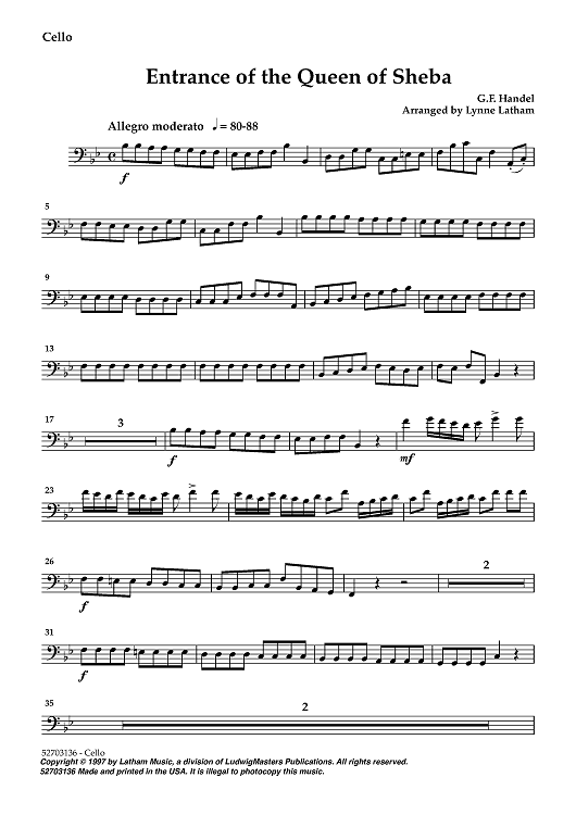 Digital Sheet Music for Entrance of the Queen of Sheba - Cello by , George Frideric Handel, Lynne Latham scored for String Quartet; id:449699
