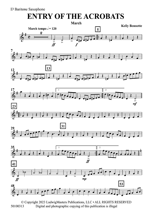 Digital Sheet Music for Entry of the Acrobats - Eb Baritone Saxophone by Kelly Bennette scored for Concert Band; id:507362