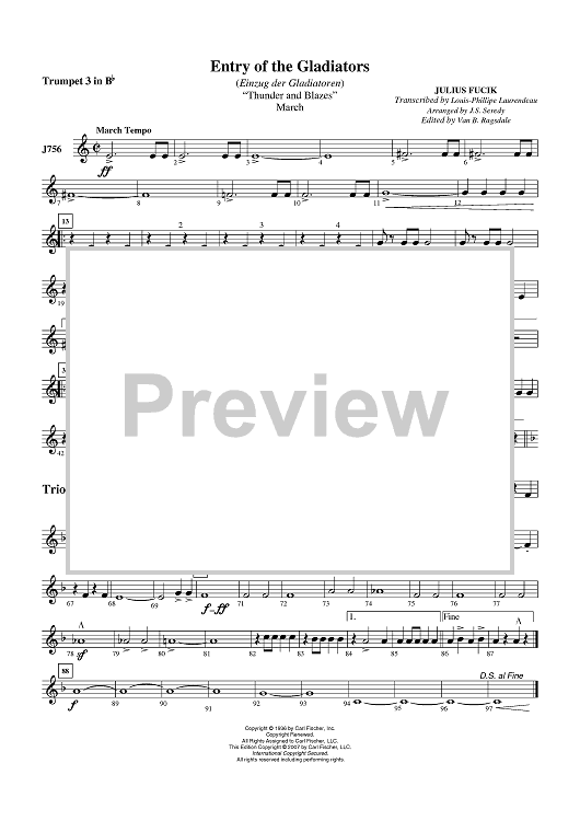 Digital Sheet Music for Entry Of The Gladiators - Trumpet 3 in B-flat by Julius Fucik, J.S. Seredy scored for Concert Band; id:407554