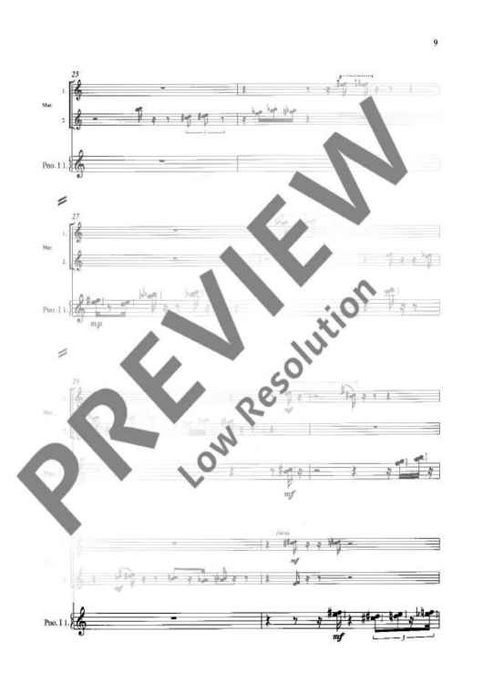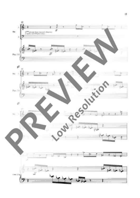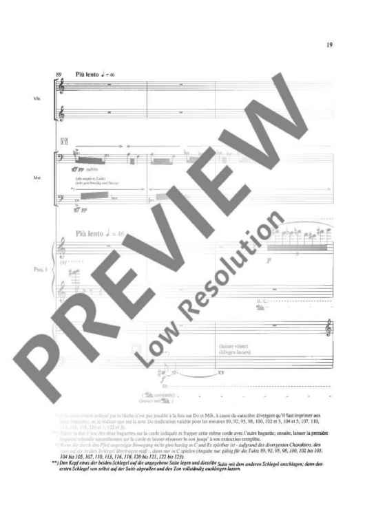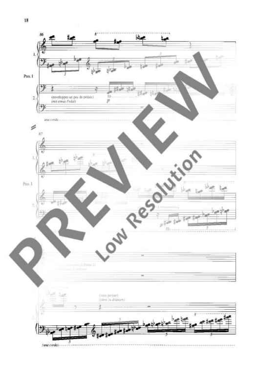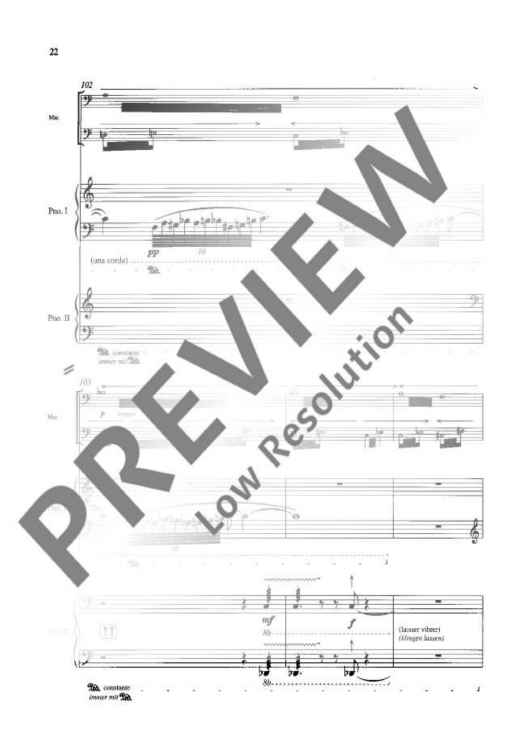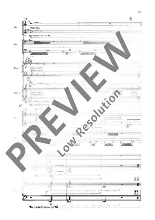 The Paris based former student of Dutilleux begins this piece in an atonal vein, full of tense contrasts, which gradually changes to arrive at a modal, atmospheric calm in the final section. The piece starts with a duet between the first piano and the marimba and finishes with a duet between the second piano and the vibraphone, the middle section is played by all instruments in varying combinations. Playing instructions in German and French.