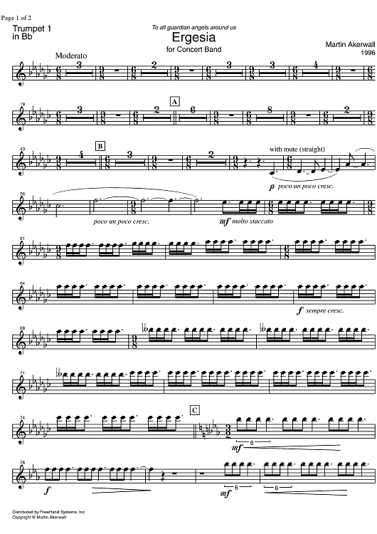 Digital Sheet Music for Ergesia - B-flat Trumpet 1 by Martin Akerwall scored for Concert Band; id:328143