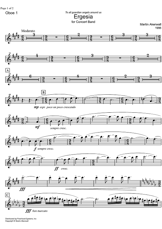 Digital Sheet Music for Ergesia - Oboe 1 by Martin Akerwall scored for Concert Band; id:328162
