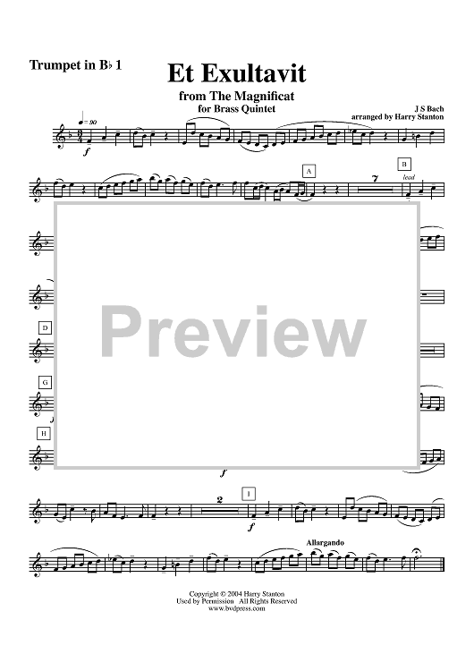 Digital Sheet Music for Et Exultavit (from The Magnificat) - Trumpet 1 by Harry Stanton, Johann Sebastian Bach scored for Brass Quintet; id:311811