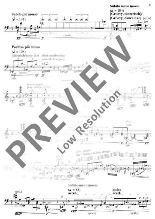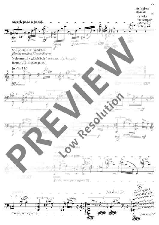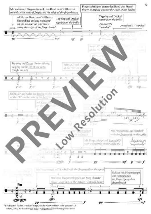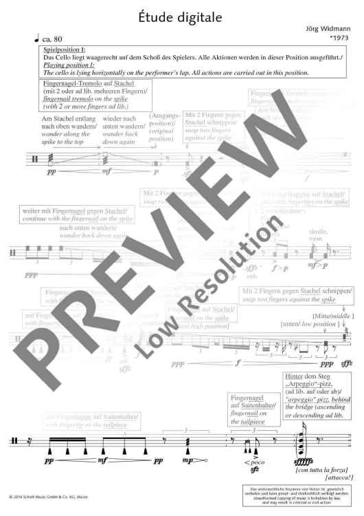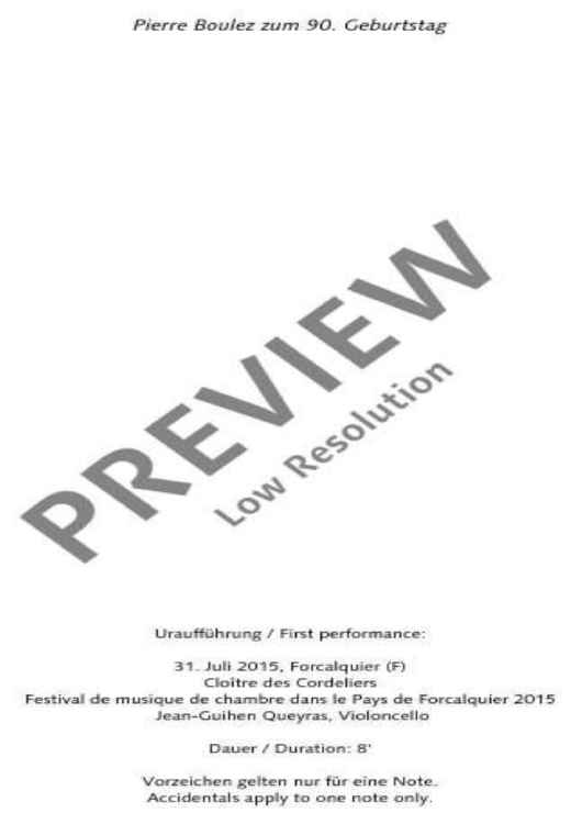 Jörg Widmann composed this short piece in 2015 for the 90th birthday of Pierre Boulez. In this piece, the cello is used in an anything but classical manner: The hands hit the fingerboard, the fingers play tremolos on the body of the cello or snip the strings. Free rhythms and figurations alternate with dance-like themes and improvisational elements while the player takes up unusual positions – sometimes the instrument lies on his or her lap, sometimes he or she carries it through the room. This listening and viewing experience is now available in a graphically demanding edition.