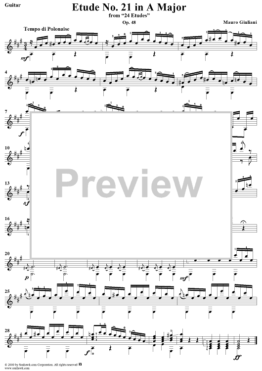 Digital Sheet Music for Etude No. 21 in A major - From "24 Etudes" Op. 48 by , Mauro Giuliani scored for Guitar Solo; id:253011