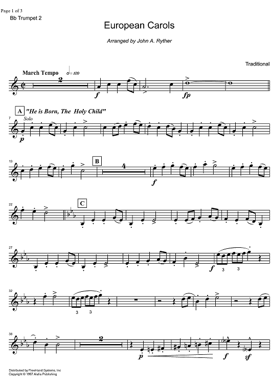 Digital Sheet Music for European Carols - B-flat Trumpet 2 by John A. Ryther, Traditional scored for Brass Quintet; id:332219