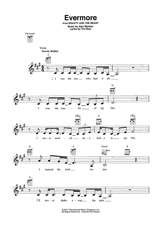 Digital Sheet Music for Evermore - from Beauty and the Beast by Tim Rice, Alan Menken scored for Ukulele/Vocal; id:465758