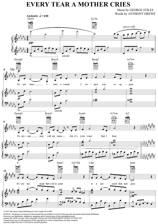 Digital Sheet Music for Every Tear a Mother Cries by George Stiles, Anthony Drewe scored for Piano/Vocal/Chords; id:295083