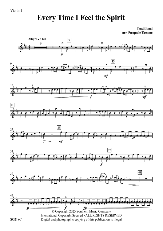 Digital Sheet Music for Every Time I Feel the Spirit - Violin 1 by Traditional, Pasquale Tassone scored for String Orchestra; id:507145