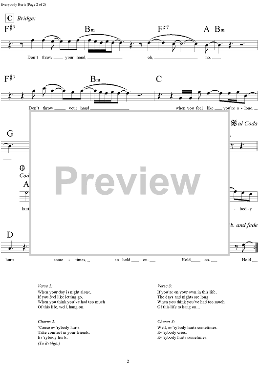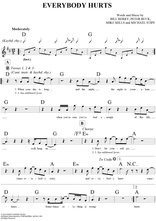 Digital Sheet Music for Everybody Hurts by , R.E.M., Michael Stipe, Peter Buck, Mike Mills, Bill Berry scored for Lead Sheet; id:293904