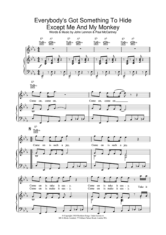 Digital Sheet Music for Everybody's Got Something to Hide Except Me and My Monkey by Paul McCartney, The Beatles, John Lennon scored for Piano/Vocal/Chords; id:375812