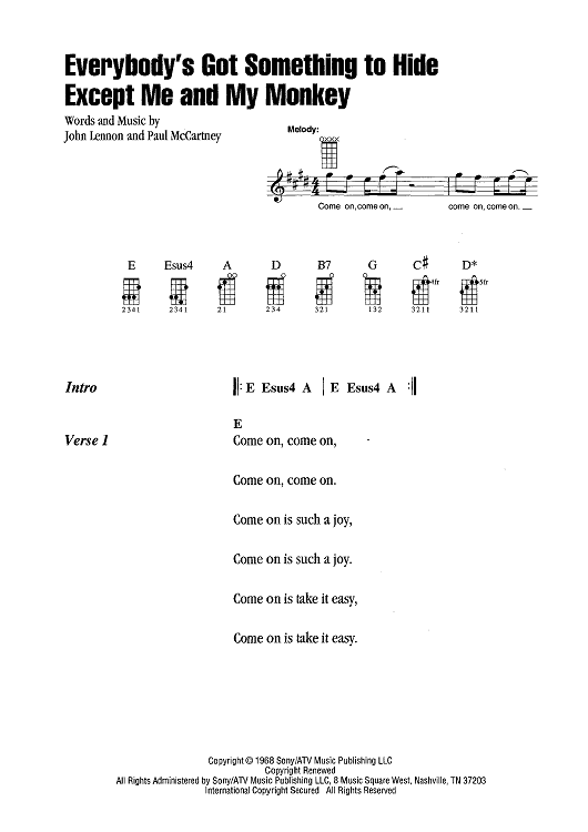Digital Sheet Music for Everybody's Got Something to Hide Except Me and My Monkey by Paul McCartney, The Beatles, John Lennon scored for Ukulele/Vocal; id:466349