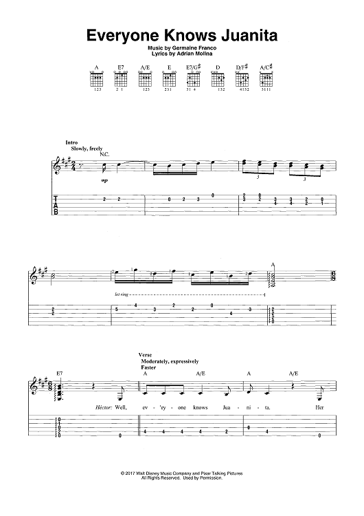 Digital Sheet Music for Everyone Knows Juanita - from COCO by Germaine Franco, Adrian Molina scored for Easy Guitar Tab/Vocal; id:466191