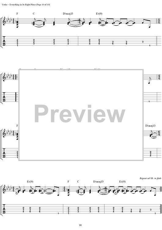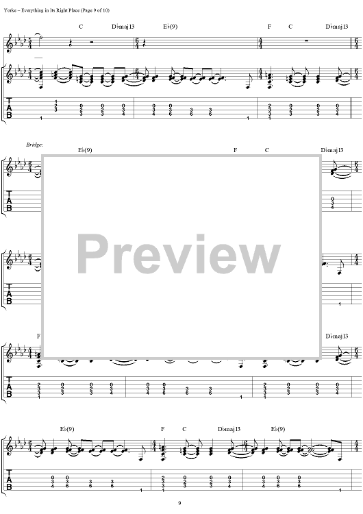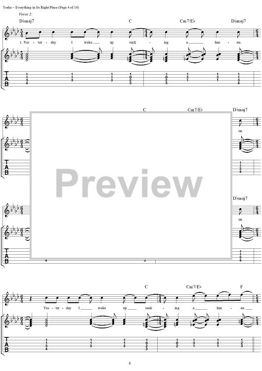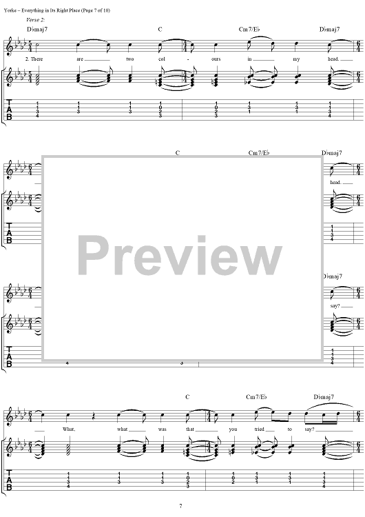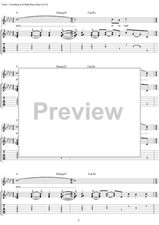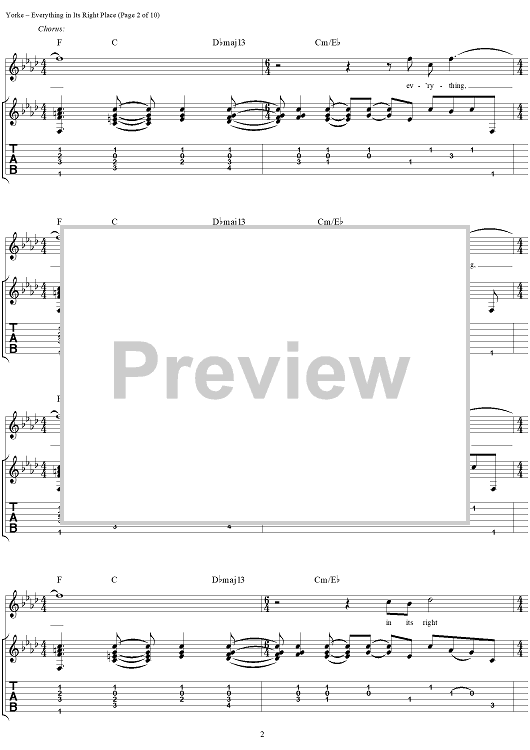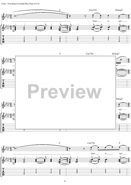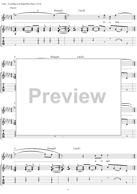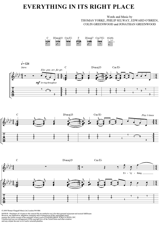 Digital Sheet Music for Everything in Its Right Place by Thomas Yorke, Jonathan Greenwood, Philip Selway, Coz, Edward O'Brien, Radiohead scored for Guitar Tab/Vocal; id:297019