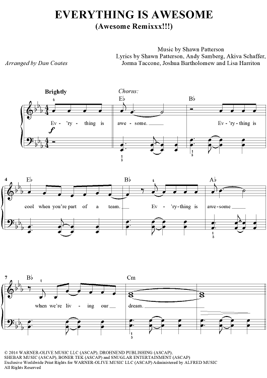 Digital Sheet Music for Everything Is Awesome (Awesome Remixxx!!!) by Dan Coates, Shawn Patterson, Andy Samberg, Akiva Schaffer, Jorma Taccone, Joshua Barhtolomew, Lisa Harriton scored for Easy Piano/Vocal/Chords; id:440109