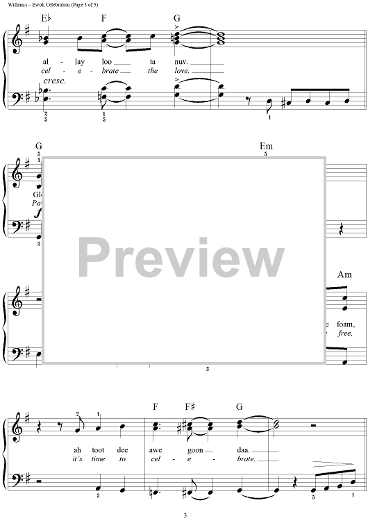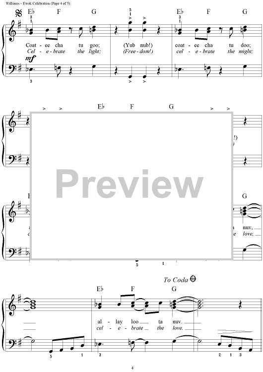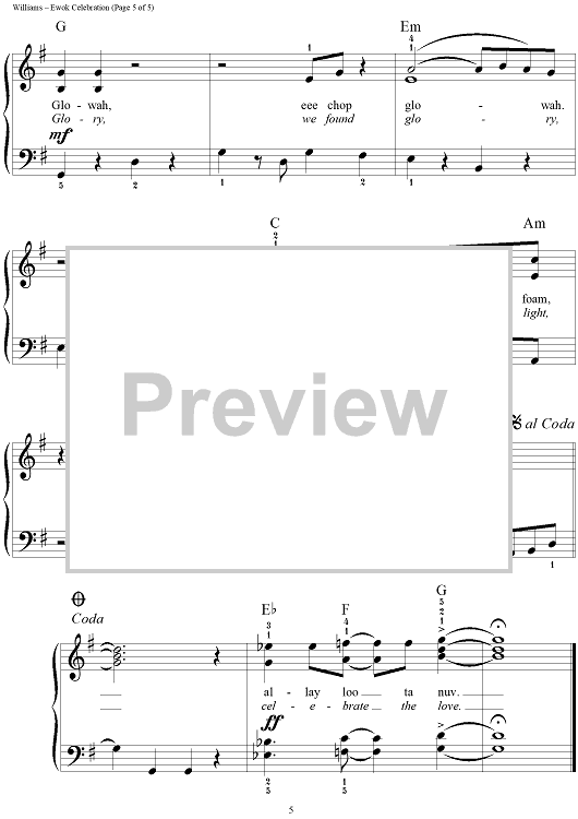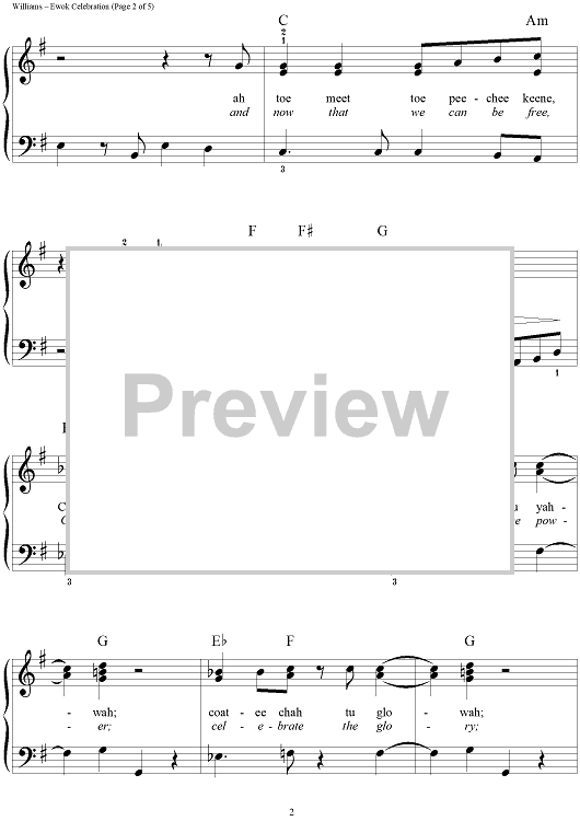 Digital Sheet Music for Ewok Celebration by Dan Coates, John Williams, Joseph Williams scored for Easy Piano/Vocal; id:234749