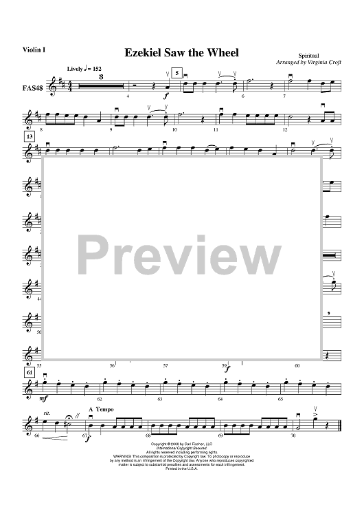 Digital Sheet Music for Ezekiel Saw The Wheel - Violin 1 by Spiritual, Virginia Croft scored for Orchestra; id:406833