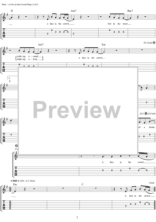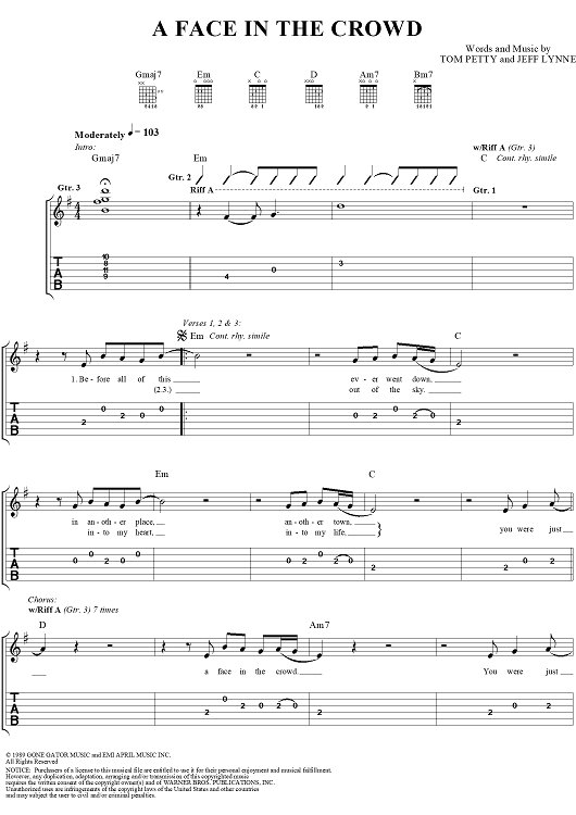 Digital Sheet Music for Face In The Crowd by Tom Petty, Jeff Lynne, Louis Martinez, Adam Levy scored for Easy Guitar Tab/Vocal; id:260073