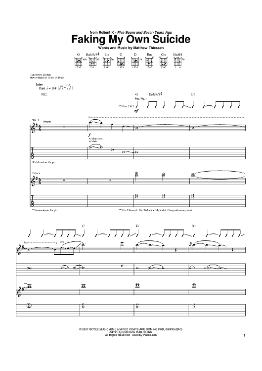 Digital Sheet Music for Faking My Own Suicide by Relient K, Matt Thiessen scored for Guitar Tab; id:397517