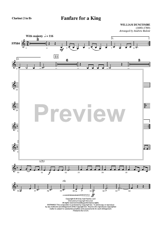 "Fanfare for a King - Clarinet 2 in B-flat" Sheet Music by William Duncombe