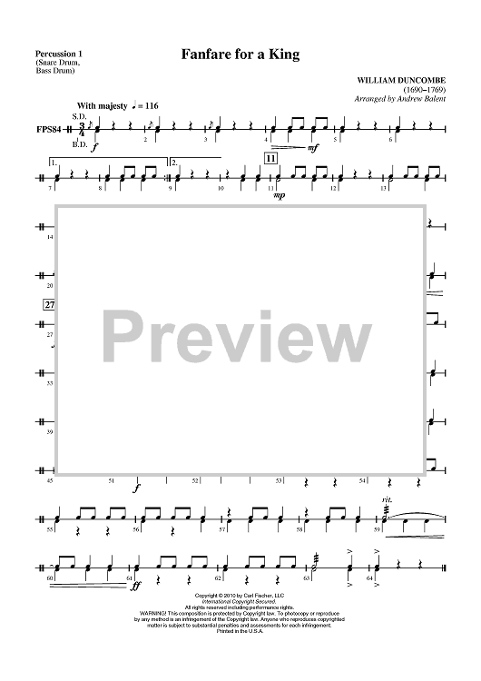 "Fanfare for a King - Percussion 1" Sheet Music by William Duncombe