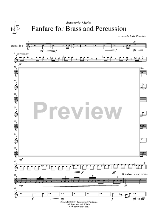 Digital Sheet Music for Fanfare for Brass and Percussion - Horn 1 in F by Armando Luis Ramirez scored for Brass Septet; id:410754
