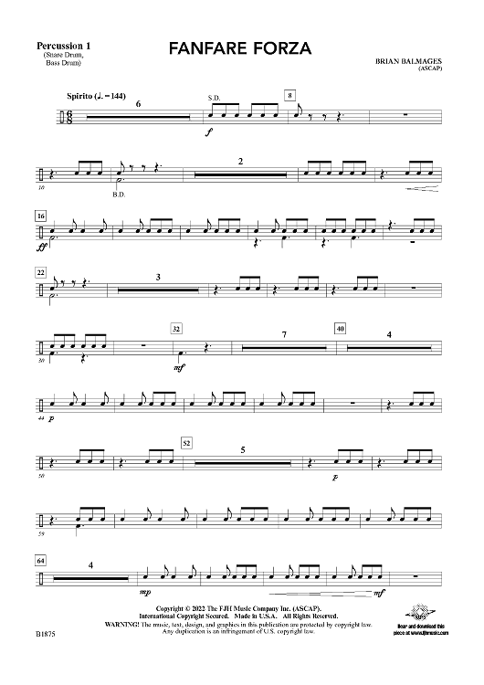 "Fanfare Forza - Percussion 1" Sheet Music by Brian Balmages