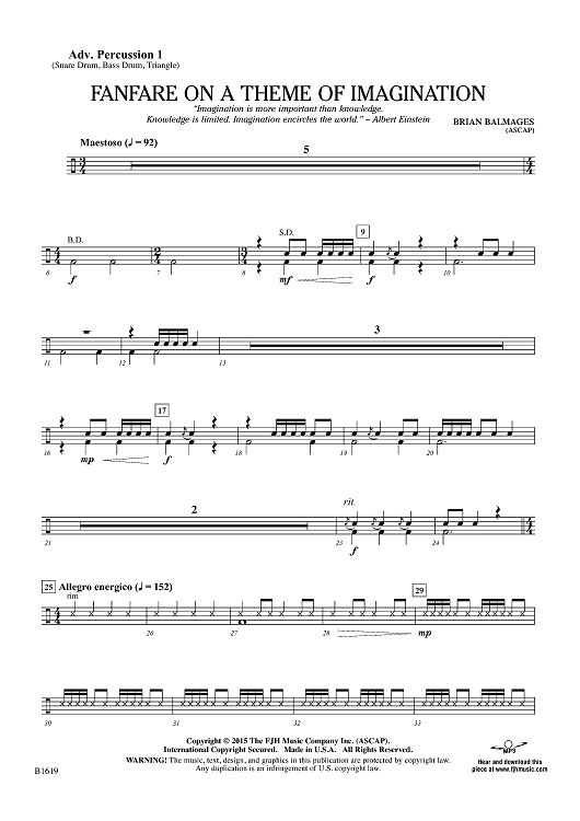 Digital Sheet Music for Fanfare on a Theme of Imagination - Advanced Percussion 1 by Brian Balmages scored for Concert Band; id:454589