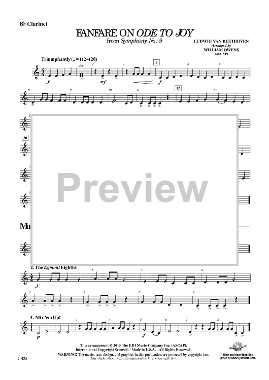 Digital Sheet Music for Fanfare On Ode to Joy - from Symphony No. 9 - Bb Clarinet by Ludwig van Beethoven, William Owens scored for Beginning Band; id:415052